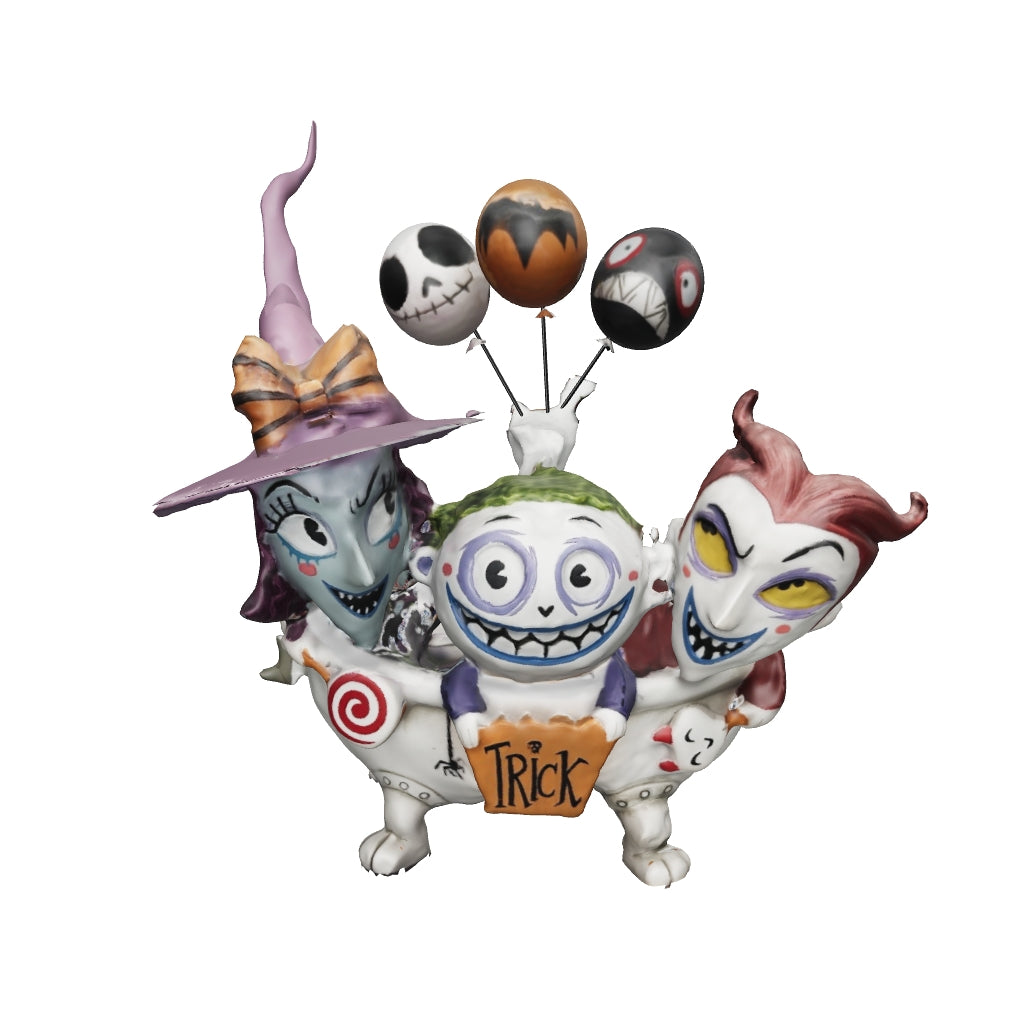 World of Miss Mindy's whimsical take on Disney's most beloved characters weaves artistry, story telling and a little bit of humor in every creation. Together in a tub, Lock, Shock, and Barrel, caw and cackle this holiday. With balloons, candy, and a trick-or-treat bag, the trio prepares for a Halloween of spooky shenanigans. Reimagined by Miss Mindy this ghoulish group has never looked cuter. The Disney The World of Miss Mindy Nightmare Before Christmas Lock Shock and Barrel Statue is a must have for fans of the movie. Made of resin. Measures about 7 1/10-inches tall x 6 4/5-inches long x 3 3/4-inches wide.