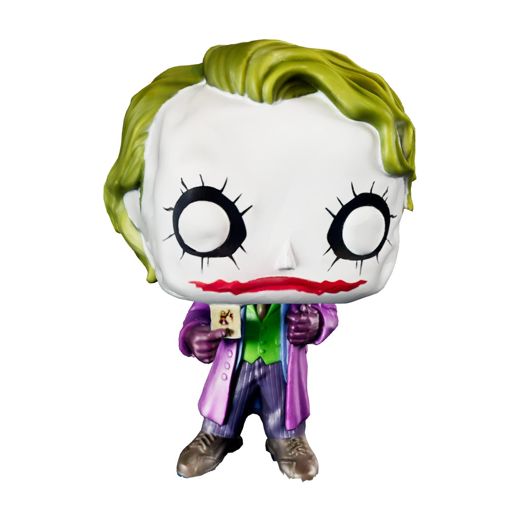 This 10" Funko Pop depicts his Joker in a purple suit, in full makeup, and holding a Joker card.